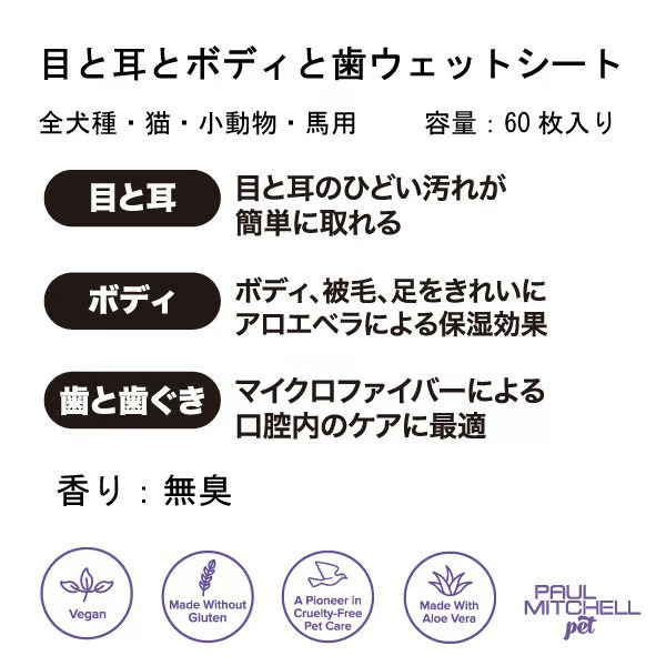 マイクロファイバーウェットシートで、力を入れずにさっと拭いて、汚れすっきり! ・アロエベラエキス、キャスターオイル配合 ・Wビーガン成分配合 ・無臭タイプ