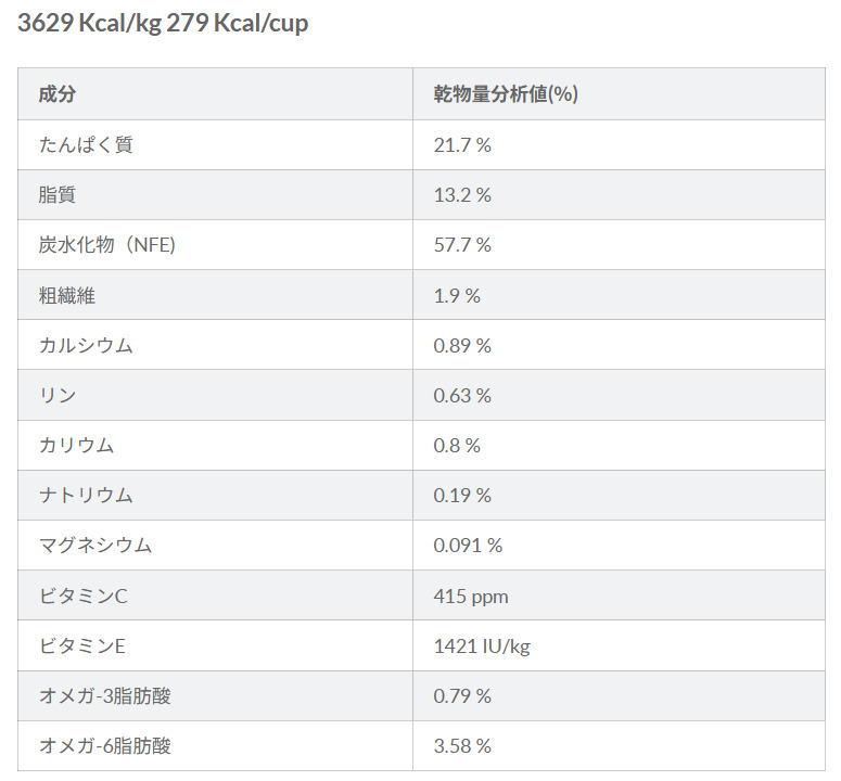 乾物量分析値(%)は平均的な値を表示しているため、パッケージに記載されている値と多少異なる場合がありますので、ご了承ください。