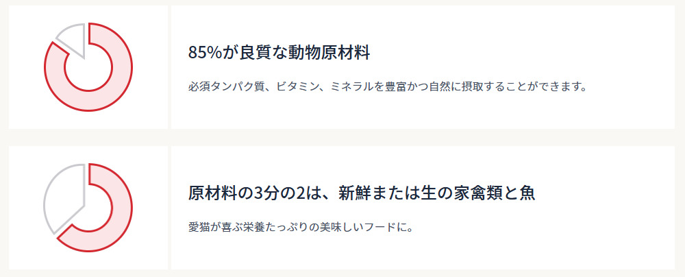 粗たんぱく質 40%以上、脂肪分 19%以上、粗繊維 3%以下、粗灰分 9%以下、水分 10%以下、カルシウム/リン 1.6%以上/1.2%以上、マグネシウム/タウリン 0.1%以上/0.3%以上、オメガ6/オメガ3 2.1%以上/2.1%以上、DHA/EPA 0.8%以上/0.5%以上
