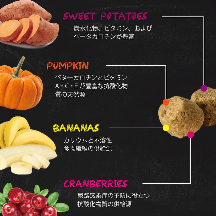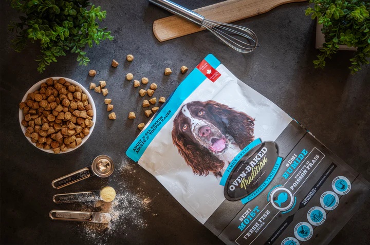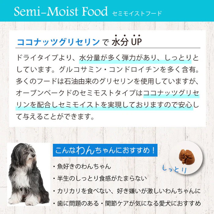 オーブンベークドよりセミモイスト(半生)が登場! ドライタイプより、水分量が多く弾力があり、しっとりとしています。 グルコサミン・コンドロイチンを多く含有。 関節ケアが気になる愛犬に。
