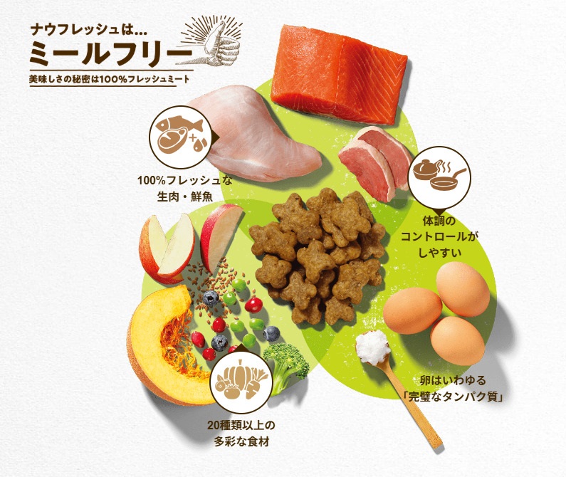 NOW FRESHは、生(フレッシュ)の食材にとことんこだわり、乾燥肉やミートミールを使わない「100%」新鮮な生肉・鮮魚を使っています。