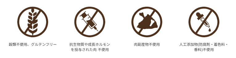 タンパク質源として、レンダリングミートミールや肉副産物を一切使用していません。