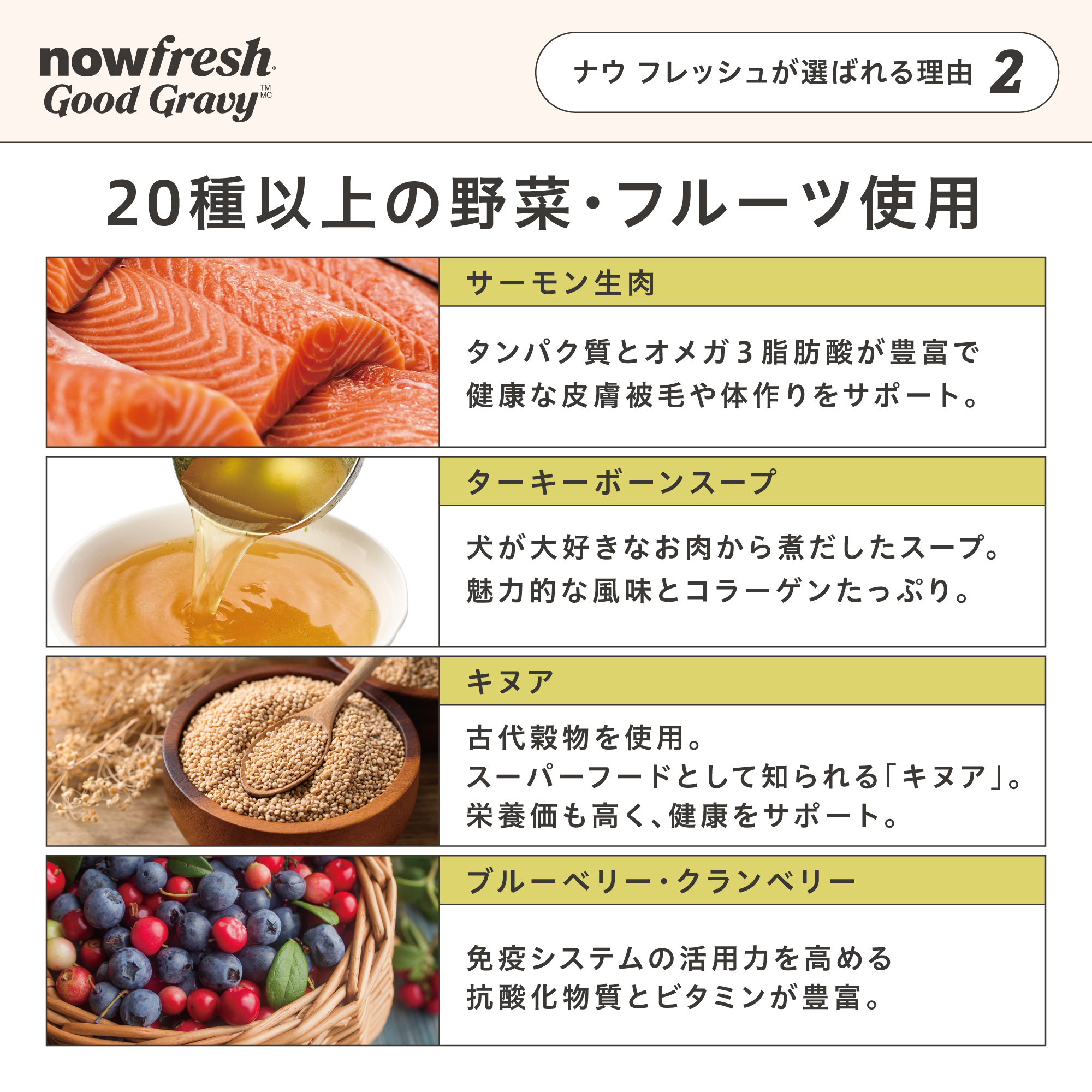 CFIA(カナダ食品検査庁)基準で人間用として合格した食材を厳選し、さらに一歩進んで、その食材の鮮度まで追求したこだわりこそが、NOW FRESH最大の特徴であり美味しさの秘密です。