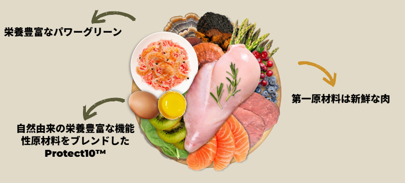 美味しさと栄養を追求したフリーランチキンレシピは、新鮮な鶏肉と七面鳥肉の組み合わせ、全卵、そして魚介類をたくさん使用していることが特長です。
