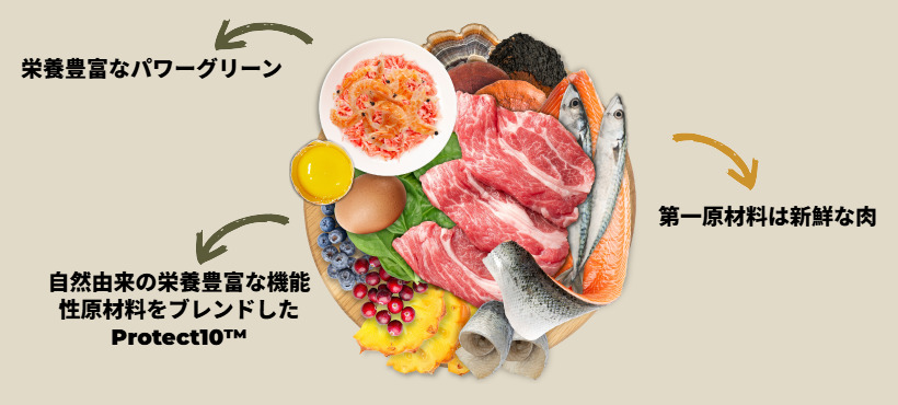 ・栄養豊富なたんぱく質と必須脂肪の供給源である新鮮な肉を多く含んでいます。 ・活力アップのために、栄養豊富なパワーグリーンと機能性原材料であるProtect10(TM)を配合しています。