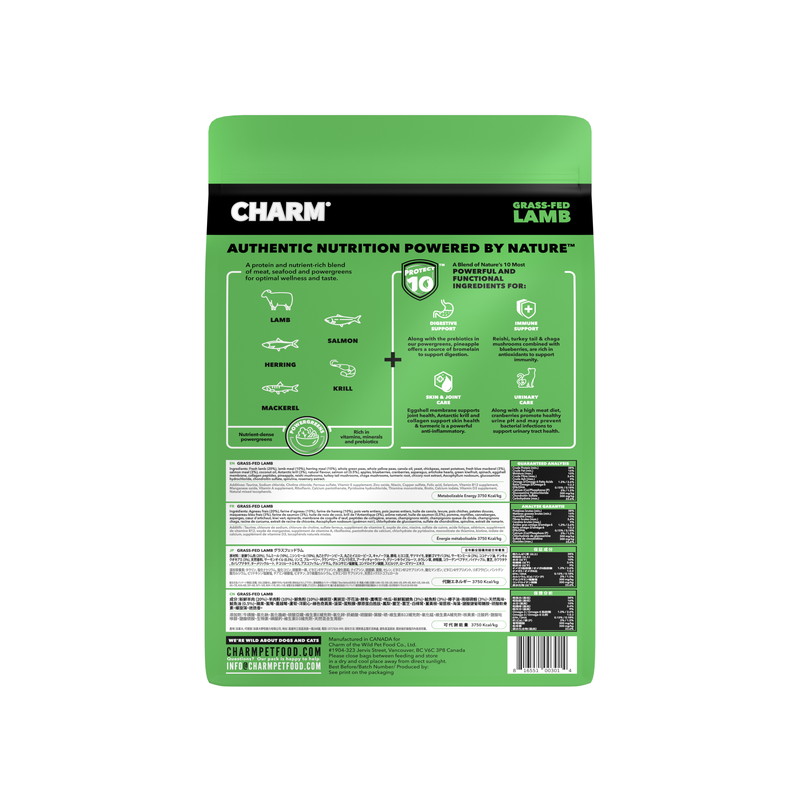 新鮮ラム肉 (20%)、ラムミール (10%)、ニシンミール (10%)、丸ごとグリーンピース、丸ごとイエローピース、キャノーラ油、酵母、ヒヨコ豆、サツマイモ、新鮮ゴマサバ (3%)、サーモンミール (3%)、ココナッツ油、ナンキョクオキアミ (3%)、天然香料、サーモンオイル (0.5%)、リンゴ、ブルーベリー、クランベリー、アスパラガス、アーティチョークハート、グリーンキウイフルーツ、ホウレン草、卵殻膜、コラーゲンペプチド、パイナップル、霊芝、カワラタケ、カバノアナタケ、ターメリックルート、チコリルートエキス、アスコフィラム・ノドサム、グルコサミン塩酸塩、コンドロイチン硫酸、スピルリナ、ローズマリーエキス