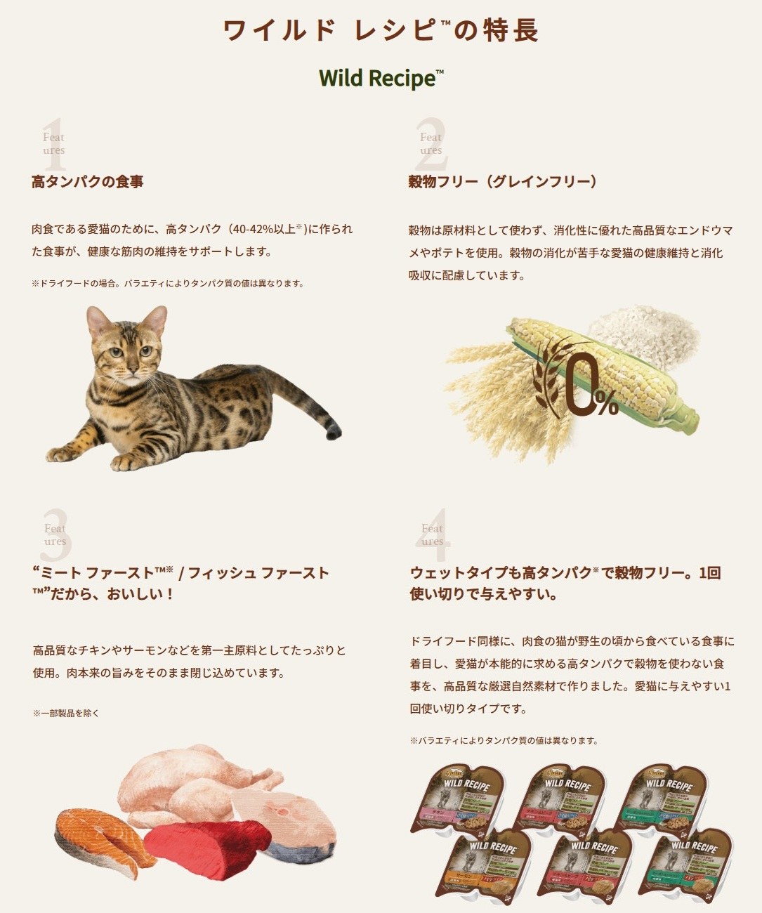 ニュートロ ワイルド レシピは、肉食の猫が野生の頃から食べている食事に着目し、愛猫が本能的に求める高タンパク*で穀物を使わない食事を、高品質な厳選自然素材で作りました。