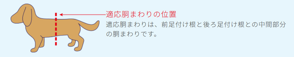 ※サイズをお選びの際は「適応胴まわり」を参考にお選びください。 ※上記の表は目安です。愛犬の成長度合い、体型によりサイズが異なる場合がございます。