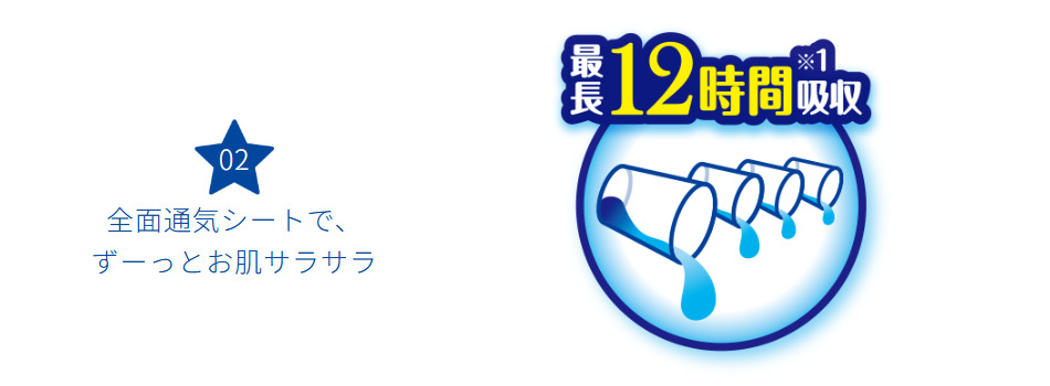 最長12時間(オシッコ約4回分)*の吸収力でサラッと感続きモレ安心!