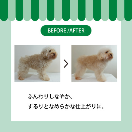 清浄効果のあるティーツリーをはじめとした6つの植物成分と紅藻エキス&植物性ヒアルロン酸が、被毛をふんわりしなやか、するりとなめらかに仕上げる植物成分配合のナチュラルシャンプーです。