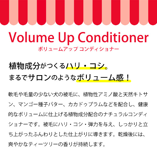 軟毛や毛量の少ない犬の被毛に、植物性アミノ酸と天然キトサン、マンゴー種子バター、カカドゥプラムなどを配合し、健康的なボリュームに仕上げる植物成分配合のナチュラルコンディショナーです。