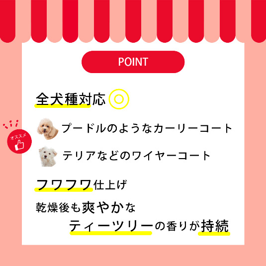 軟毛や毛量の少ない犬の被毛に、植物性アミノ酸と天然キトサン、マンゴー種子バター、カカドゥプラムなどを配合し、健康的なボリュームに仕上げる植物成分配合のナチュラルコンディショナーです。 被毛にハリ・コシ・弾力を与え、しっかりと立ち上がったふんわりとした仕上がりに導きます。 乾燥後には、爽やかなティーツリーの香りが持続します。 こんな時におすすめ! ・シャンプーの後に ・軟毛やハリコシの少ない被毛をハリのあるしなやかな仕上がりにしたい時に ・ふんわりしたボリューム感を出したい時に 【使用方法】 シャンプー後、犬の全身にコンディショナーの原液、または2~8倍に薄めたものを適量なじませた後、洗い流してください。
