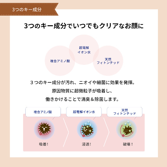 3つのキー成分が汚れ、ニオイや細菌に効果を発揮。 原因物質に超微粒子が吸着し、働きかけることで消臭&除菌します。 【超電解イオン水】 水を電気分解した超電解イオン水は通常の水よりも浸透力が強く、汚れの細部にまで染み込み、汚れの中のたんぱく質を分解することができます。 【複合アミノ酸】 天然由来の複合アミノ酸。悪臭の原因に結合して消臭&除菌。 【天然フィトンチッド】 樹木から発散される芳香成分。悪臭の原因に結合してニオイを中和分解。