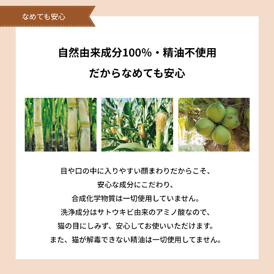 洗浄成分はサトウキビ由来のアミノ酸なので、猫の目にしみず、安心してお使いいただけます。