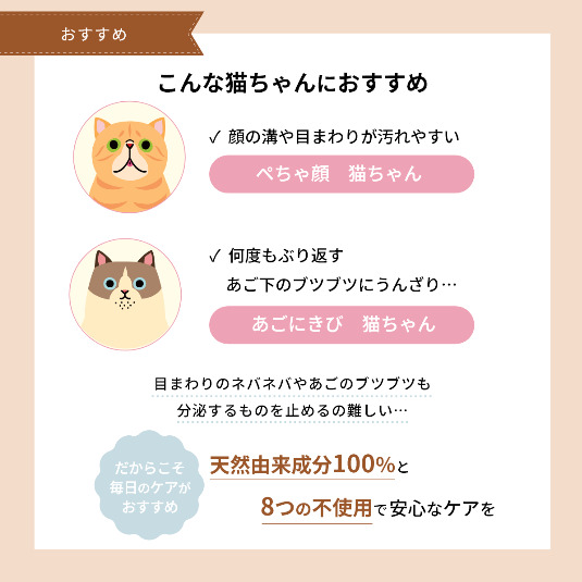 目や口の中に入りやすい顔まわりだからこそ、安心な成分にこだわりました。 経皮吸収にも配慮し、合成化学物質は一切使用していません。 洗浄成分はサトウキビ由来のアミノ酸なので、猫の目にしみず、安心してお使いいただけます。 また、猫が解毒できない精油(エッセンシャルオイル)は一切使用していません。 8つの不使用! ・界面活性剤(非イオン界面活性剤も不使用) ・パラベン ・合成着色料 ・紫外線吸収剤 ・アルコール ・鉱物油 ・酸化防止剤 ・シリコン