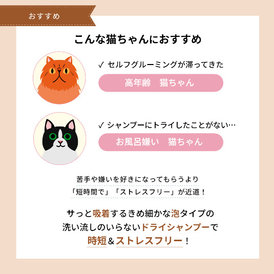 目にしみないから猫の小さなお顔も洗いやすく、すばやく清潔を保てます。