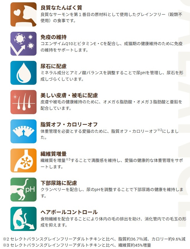 セレクトバランス グレインフリー スリム 贅沢サーモンは、太りやすい体質の成猫の健康維持や、避妊・去勢後の体重管理を多角的にサポートします。