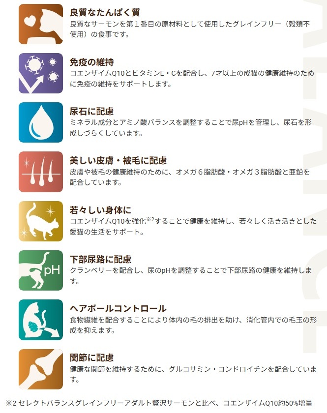 セレクトバランス グレインフリー エイジングケア 贅沢サーモンは、7才以上の成猫の健康な毎日を多角的にサポートします。