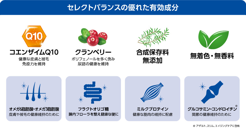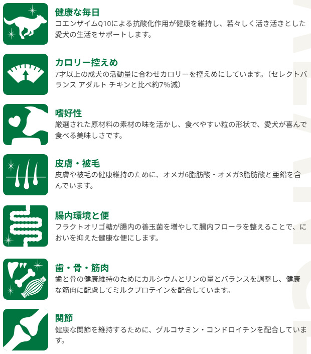 コエンザイムQ10が若々しく活き活きとした生活をサポート。活動量の減少に合わせ、カロリー控えめ。(セレクトバランス アダルト チキンと比べ、約7%減)健康な関節維持のために、グルコサミン・コンドロイチン配合。