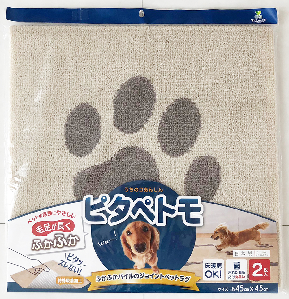 ツルッとすべって足腰に負担がかかってしまうフローリングを草原を思いっきり走り回っているようなふかふかラグへ変えてくれるペットラグ「ピタペトモ」。ペットと人が暮らす空間をもっと快適にしたいそんな想いから生まれたペットウェアです。滑って転んだりしてケガをしてしまったり、老犬の足腰への負担や冷えを和らげてくれるふかふかのペットラグは、床暖房にも使用できるのでペットはもちろん家族みんなが快適に過ごせるラグ仕様。裏面は吸着シートだから走り回ってもOK。掃除機をかけてもずれません。汚れたところだけ洗えるので、サッと取り外して洗濯機で簡単お手入れ可能。だからトイレまわりはもちろんケージ内や外にも。コーディネイト次第でカーペットのようなインテリアの邪魔をしないシンプルなモノトーン調のラグとしてもご使用いただけます。