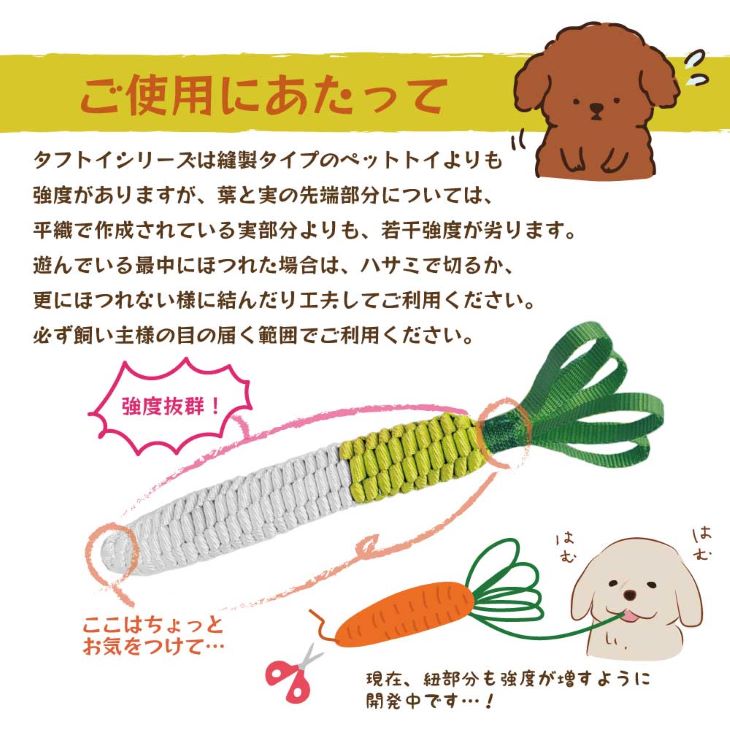 このユニークな大根のペットトイは丈夫なポリエステル平ロープ製。