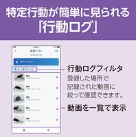 ●あんしん機能「噛みつき保護ケーブル」「転倒防止構造」●高画質・自動追尾機能「200万画素の高画質」「ペットの動きを自動追尾」●行動履歴機能「1日の行動ログを簡単に振り返れる」「1週間ダイジェスト動画」