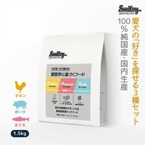 日本の犬にために開発された獣医学に基づくフード。 ノンオイルコーティング、国産生肉の使用、合成酸化防止剤無添加にこだわり、日本国内での製造。 毎日の食事を通じて、愛犬の健康をサポートします。 3種の味がセットになって飽きずにいろいろな味が楽しめる ■純国産食材使用 ■主たん白源は生肉、生魚のみ使用 ■FK-23濃縮乳酸菌配合 ■ノンオイルコーティング ・すばやくふやけてお腹にやさしい ■小麦粉・小麦グルテンフリー ・食物アレルギーに配慮 ■低GI配合 ・炭水化物に大麦を使用 ■生肉使用(ミートミール不使用) ・生肉をそのまま加工 ■国内生産 ■国産食材使用 ■香料・着色料不使用 ・原材料の色と風味がそのまま ■合成酸化防止剤無添加 ・BHT、BHA、エトキシキン不使用 ■全年齢・全犬種対応
