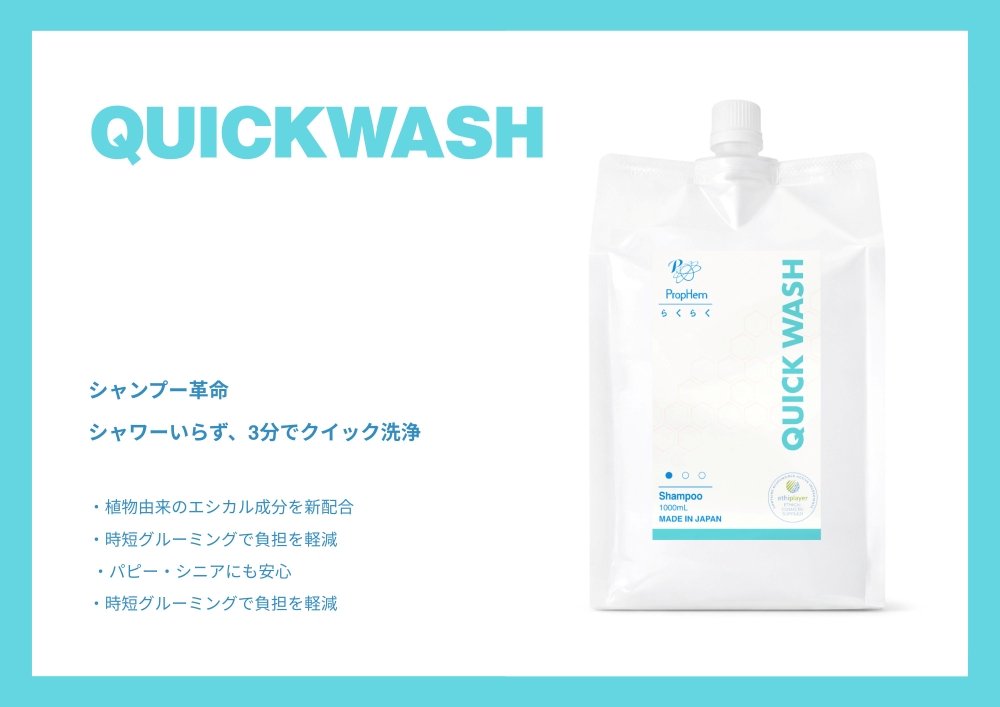 ●3分できれい、さらさら、美しい ●パピーにシャワーをかけないでシャンプーできる ●お家ケアは楽しく、サロンとは違う価値がある ●シニアに負担をかけず3分間クイックウォッシュ ●時間短縮、やさしいグルーミング 「シャワーをかけずに3分のかけ湯だけできれいになって乾かすことができれば犬の負担を減らせる」のがクイックウォッシュです。