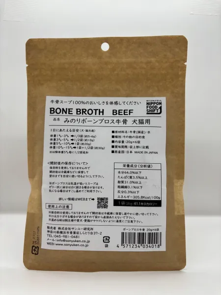 ボーンブロスとは、鮮度管理された動物の骨をじっくり煮込んだ旨味と栄養たっぷりのスープのことです。 ・アミノ酸・コラーゲン・微量ミネラルが豊富 ・滋養強壮や美容など健康管理におすすめ ・パピーからシニアまで幅広く ・おいしいスープで水分補給 ・フードにかけて食欲アップ ・天然、合成を問わず、保存料、香料、着色料は不使用
