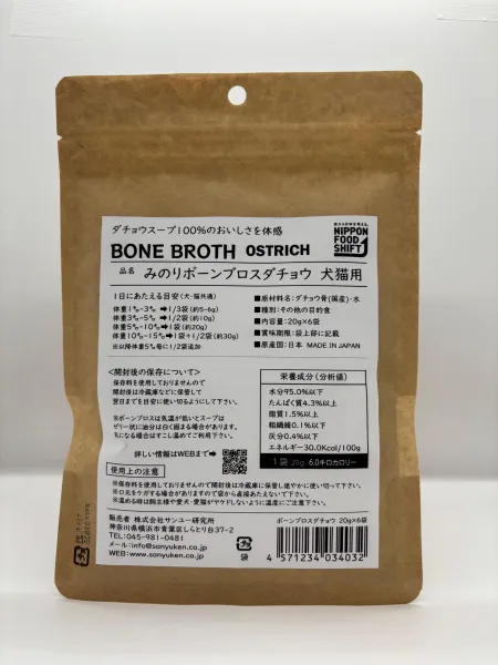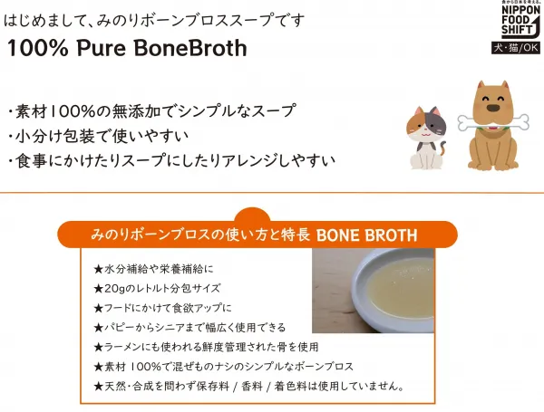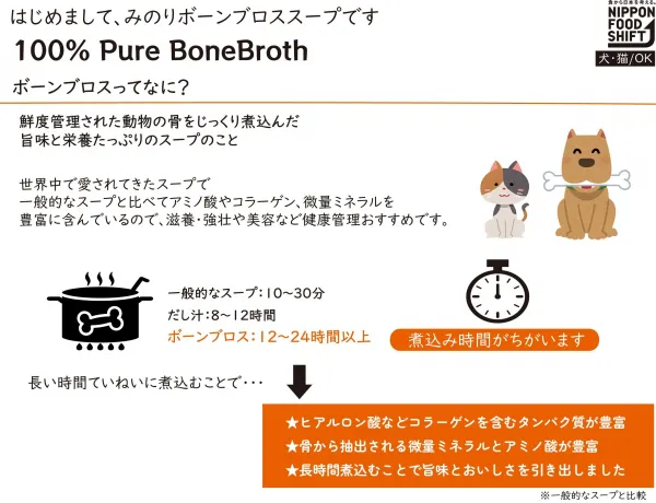 ボーンブロスとは、鮮度管理された動物の骨をじっくり煮込んだ旨味と栄養たっぷりのスープのことです。 ・アミノ酸・コラーゲン・微量ミネラルが豊富 ・滋養強壮や美容など健康管理におすすめ ・パピーからシニアまで幅広く ・おいしいスープで水分補給 ・フードにかけて食欲アップ ・天然、合成を問わず、保存料、香料、着色料は不使用