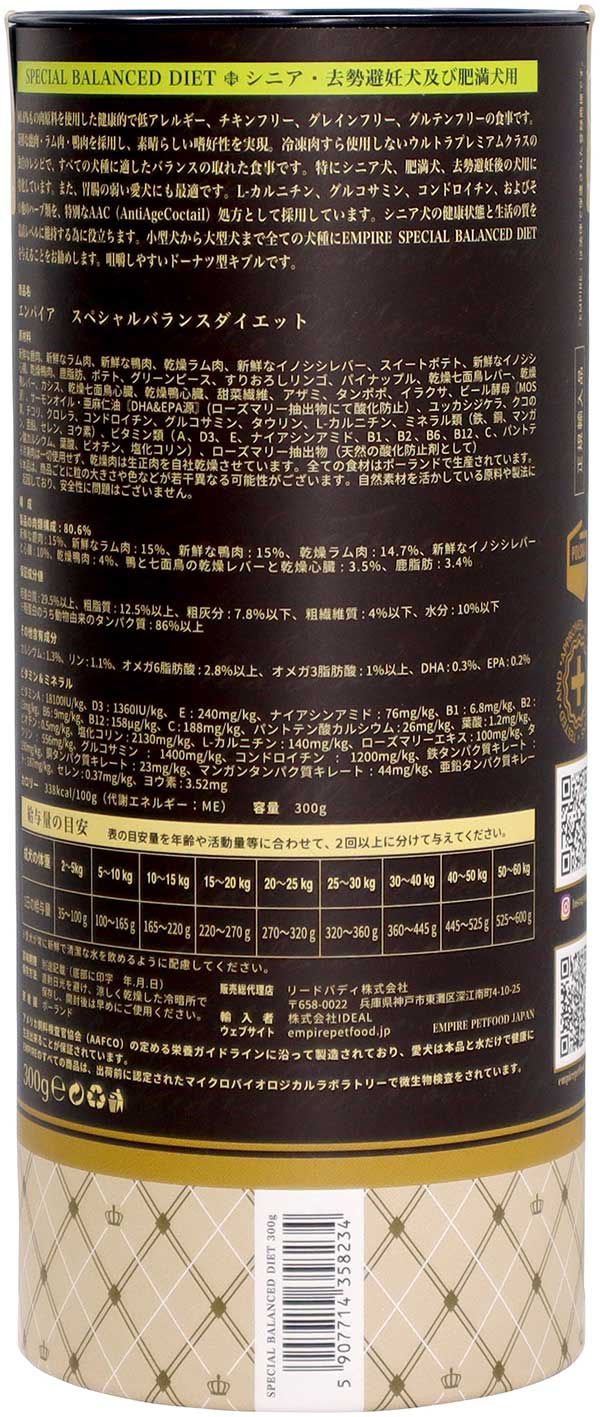 多くのジビエ肉を使用した健康的で低アレルギー、チキンフリー、グレインフリー、グルテンフリーの食事です。新鮮な鹿肉・キジ肉・ヤマウズラ肉・鴨肉を採用し、素晴らしい嗜好性を実現。冷凍肉すら使用しないウルトラプレミアムクラスの独自のレシピで、すべての犬種に適したバランスの取れた食事です。特にシニア犬、肥満犬、去勢避妊後の犬用に特化しています。また、胃腸の弱い愛犬にも最適です。シニア犬、肥満犬、去勢避妊後等の全ての犬種にEMPIRE SPECIAL BALANCED DIETを与えることをお勧めします。咀嚼しやすいドーナツ型キブルです。冷凍肉は一切使用しておりません。乾燥肉は生正肉を自社乾燥させています。すべての食材はポーランドで生産されています。小型犬から大型犬まで全ての犬種にEMPIRE SPECIAL BALANCED DIETを与えることをお勧めします。