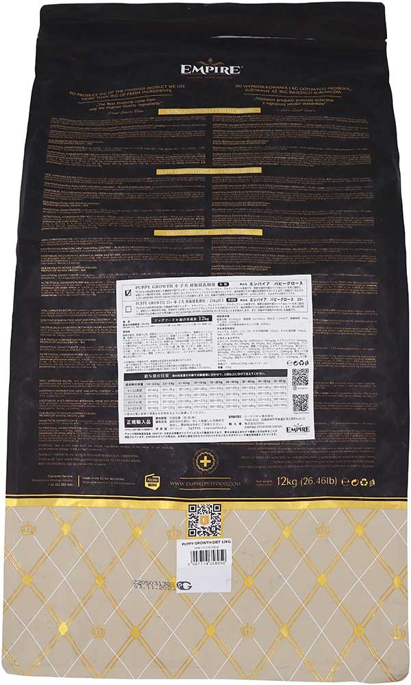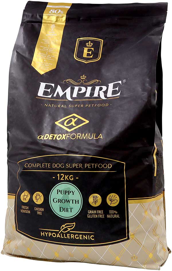 多くのジビエ肉を使用した健康的で低アレルギー、チキンフリー、グレインフリー、グルテンフリーの食事です。新鮮な鹿肉や猪のハート&レバーを多く採用し、素晴らしい嗜好性を実現。冷凍肉すら使用しないウルトラプレミアムクラスの独自のレシピで、成長初期の子犬の適切な発育をサポートします。生後12ヶ月までの子犬にはEMPIRE PUPPY GROWTH DIETを与えることをお勧めします。また、妊娠中や授乳中の母犬にも最適です。ふやかしやすく、与えやすい小粒タイプです。冷凍肉は一切使用しておりません。乾燥肉は生正肉を自社乾燥させています。すべての食材はポーランドで生産されています。