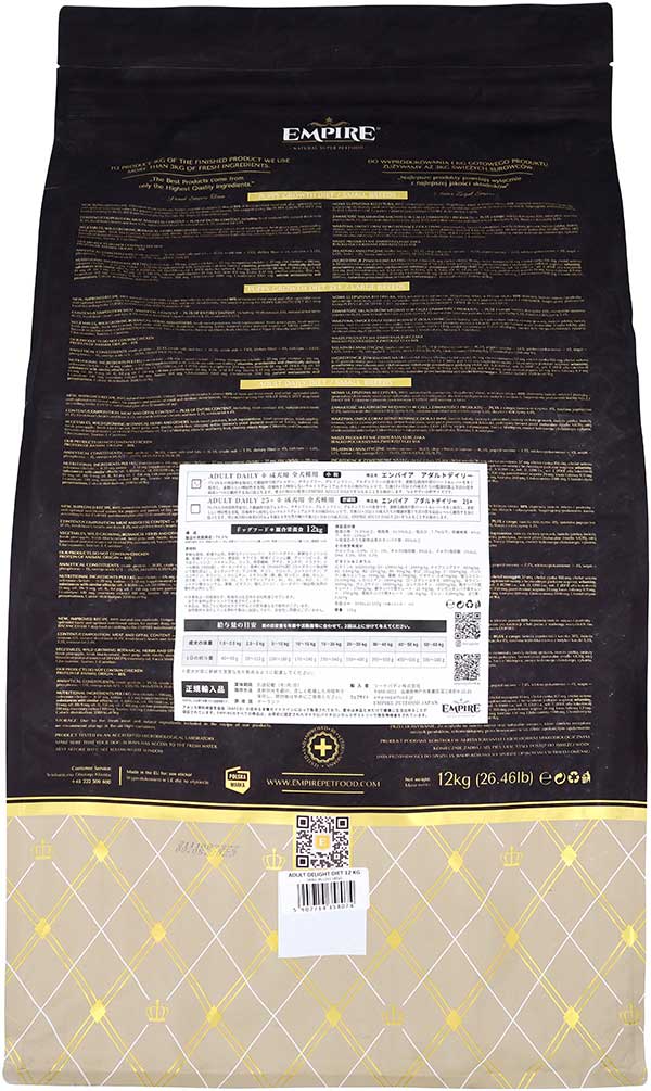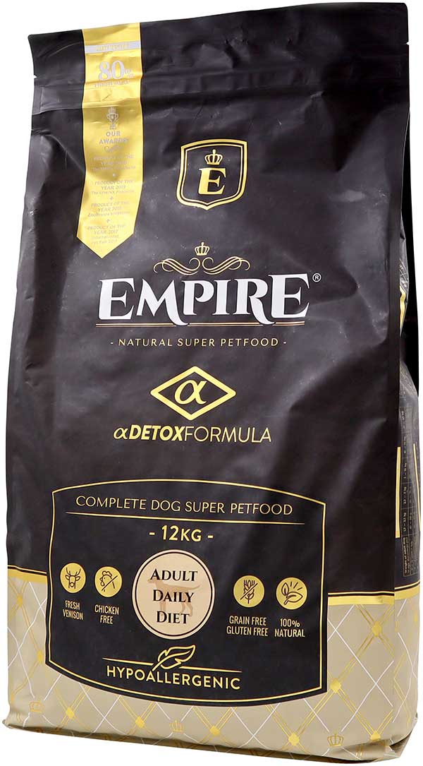 多くのジビエ肉を使用した健康的で低アレルギー、チキンフリー、グレインフリー、グルテンフリーの食事です。新鮮な鹿肉や猪のハート&レバーを多く採用し、素晴らしい嗜好性を実現。冷凍肉すら使用しないウルトラプレミアムクラスの独自のレシピで、生後12ヶ月以上の成犬たちの健康状態と生活の質を最高レベルに維持する為に役立ちます。生後12ヶ月からの成犬には、毎日の食事にEMPIRE ADULT DAILY DIETを与えることをお勧めします。与えやすい小粒サイズです。冷凍肉は一切使用しておりません。乾燥肉は生正肉を自社乾燥させています。すべての食材はポーランドで生産されています。