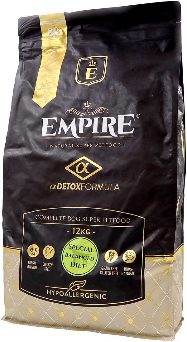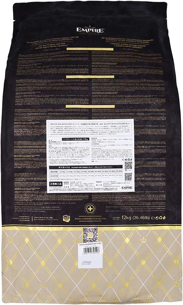 多くのジビエ肉を使用した健康的で低アレルギー、チキンフリー、グレインフリー、グルテンフリーの食事です。新鮮な鹿肉・キジ肉・ヤマウズラ肉・鴨肉を採用し、素晴らしい嗜好性を実現。冷凍肉すら使用しないウルトラプレミアムクラスの独自のレシピで、すべての犬種に適したバランスの取れた食事です。特にシニア犬、肥満犬、去勢避妊後の犬用に特化しています。また、胃腸の弱い愛犬にも最適です。シニア犬、肥満犬、去勢避妊後等の全ての犬種にEMPIRE SPECIAL BALANCED DIETを与えることをお勧めします。咀嚼しやすいドーナツ型キブルです。冷凍肉は一切使用しておりません。乾燥肉は生正肉を自社乾燥させています。すべての食材はポーランドで生産されています。小型犬から大型犬まで全ての犬種にEMPIRE SPECIAL BALANCED DIETを与えることをお勧めします。