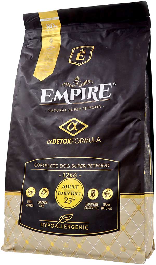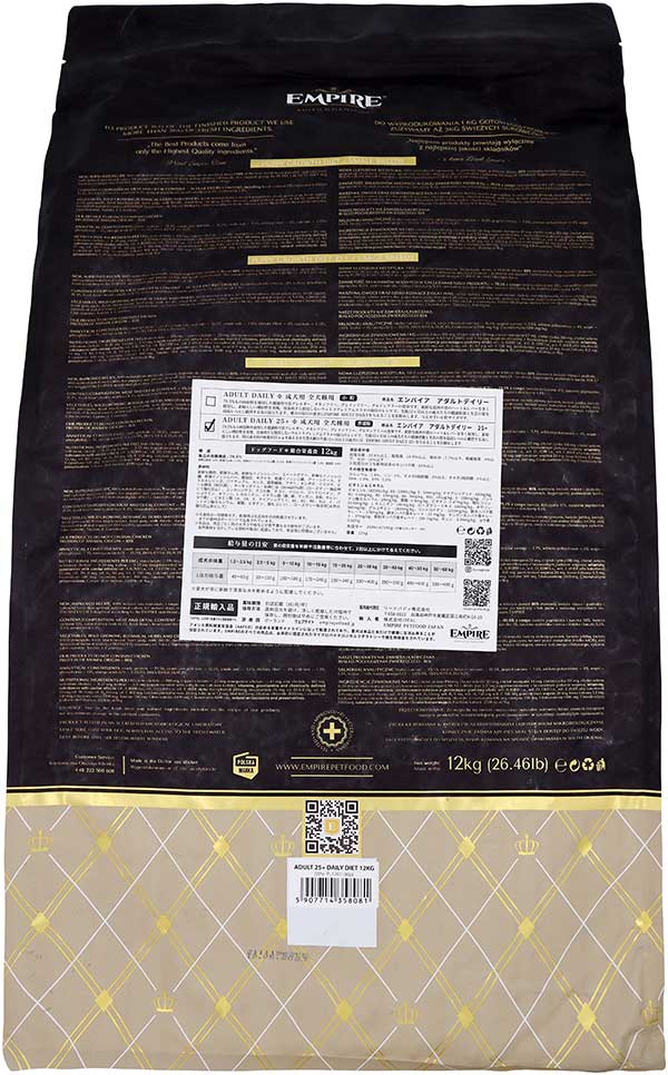 【25+は中大型犬向け商品です】 49.5%もの肉原料を使用した健康的で低アレルギー、チキンフリー、グレインフリー、グルテンフリーの食事です。新鮮な鹿肉・キジ肉・ヤマウズラ肉・鴨肉を採用し、素晴らしい嗜好性を実現。冷凍肉すら使用しないウルトラプレミアムクラスの独自のレシピで、生後12ヶ月以上の成犬たちの健康状態と生活の質を最高レベルに維持する為に役立ちます。生後12ヶ月からの成犬には、毎日の食事にEMPIRE ADULT DAILY DIETを与えることをお勧めします。与えやすい小粒サイズです。冷凍肉は一切使用しておりません。乾燥肉は生正肉を自社乾燥させています。すべての食材はポーランドで生産されています。