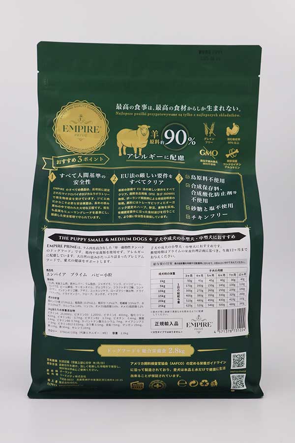羊原料約90%と高含有。食物アレルギーに徹底的に配慮したモノプロテインフードです。子犬や成犬の小型犬・中型犬におすすめです。推奨時期はプライムの栄養管理計画に基づき、生後12ヶ月までお与えください。