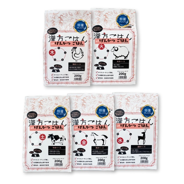 「げんかつごはん」は、ピリカメディカルサロンが開発した成犬用総合栄養食。 健康なわんちゃんたちに食べてもらって元気な体を維持してもらうためのごはんです。 お肉や野菜などの材料を細かく刻んで煮込んだ手作りごはん風の漢方ごはんで作ったドライタイプのドッグフードです。 療法食ではありませんので、季節や気候、わんちゃんの体質や体調を考慮して選んでいただくのはもちろん、その日の気分で選んでいただくこともできます。 「げんかつごはん」は東洋医学の五行思想に基づいて5種類のラインナップがあり、食材もそれぞれ異なります。 お肉や野菜のほかに、ナツメ、サンザシ、陳皮、クコの実などの食材も配合されています。 安心・安全で手軽にあげることができるドライフード。 人々の料理と同じように、丁寧に作りました。 薬膳理論に基づいて選び抜いた食材を配合しています。 材料はすべて人が食べられる品質のものを使用し、総合栄養食にするために添加しているビタミンやミネラル類なども、すべて日本国内で使用が許可されている人の食品用のものを使っています。 着色料、保存料、酸化防止剤は使用していませんが、フードのため未開封なら製造から1年半保存できます。 生命力にあふれたヒューマンレベルの食材を用い、薬膳理論に基づいて食材を選んだげんかつごはんを提供することで、すべてのわんちゃんたちのげんかつを応援します。