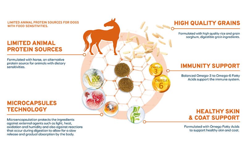 シングルアニマルプロテイン:消化の良い赤身の肉である馬肉を配合した敏感な愛犬用