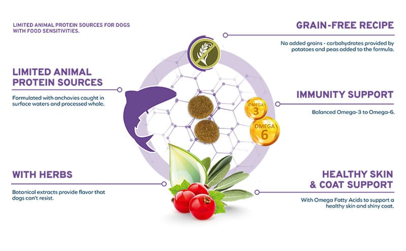 シングルアニマルプロテイン:動物性タンパクは汚染されていない表層水で捕獲されたアンチョビ(イワシ)を丸ごと加工したもののみを単一使用