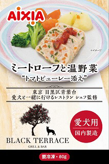 豚肉と鶏肉をミックスしたミートローフと消化にやさしい温野菜。かつおだしのおいしさを閉じ込めた寒天ジュレで野菜が苦手な愛犬も食欲アップ。着色料、発色剤、増粘安定剤不使用でヒューマングレードの食材を使用した国産品。