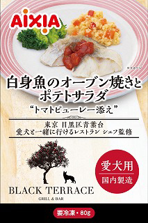 高たんぱく質・低脂質のすけとうだらのオーブン焼きと味噌風味の酵豆粉を配合したおいしさ抜群のポテトサラダ。お肉を食べられない愛犬におすすめ。着色料、発色剤、増粘安定剤不使用でヒューマングレードの食材を使用した国産品。