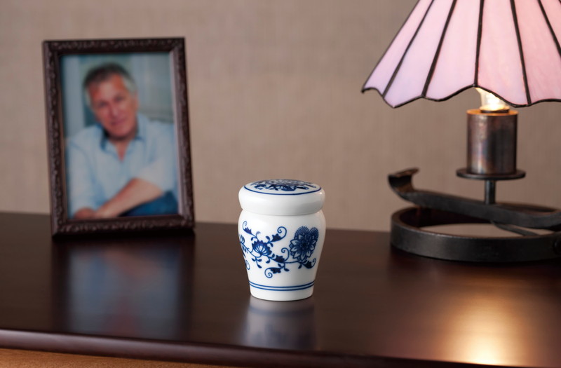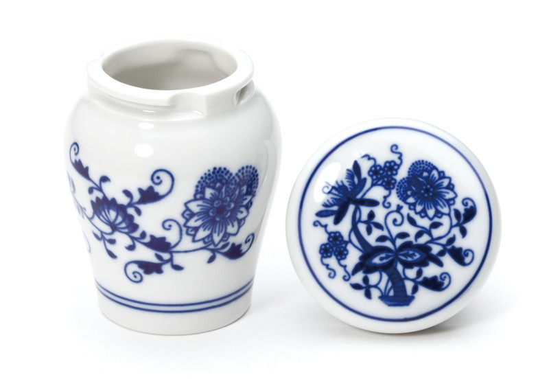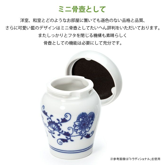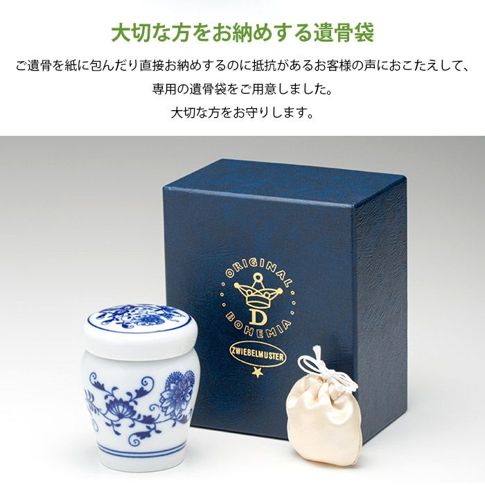 白磁に藍の伝統と新しさが美しい、ボヘミア ブルーオニオンのミニ骨壺です。