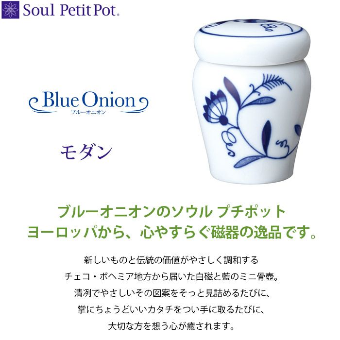 白磁に藍の伝統と新しさが美しい、ボヘミア ブルーオニオンのミニ骨壺です。伝統の意匠をバランスよくまとめて、品のある表情に仕上げました。