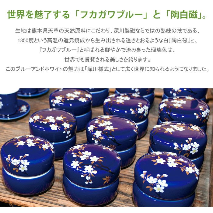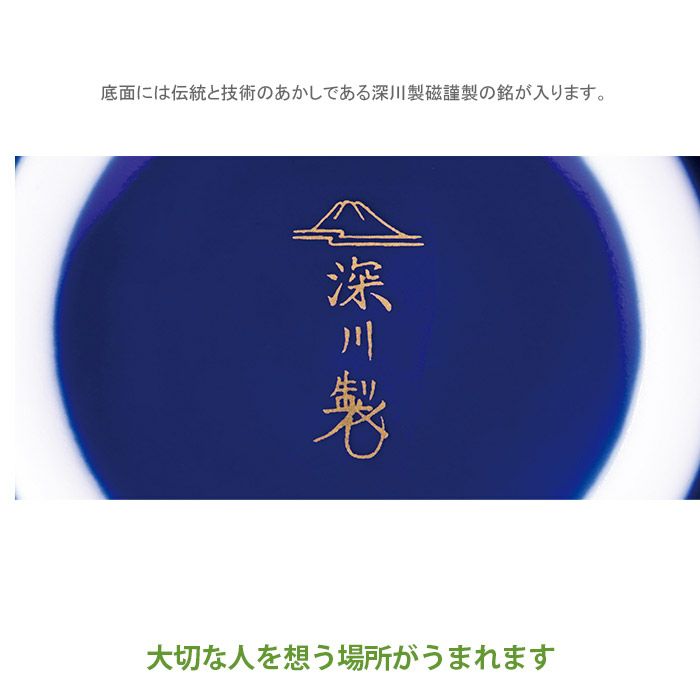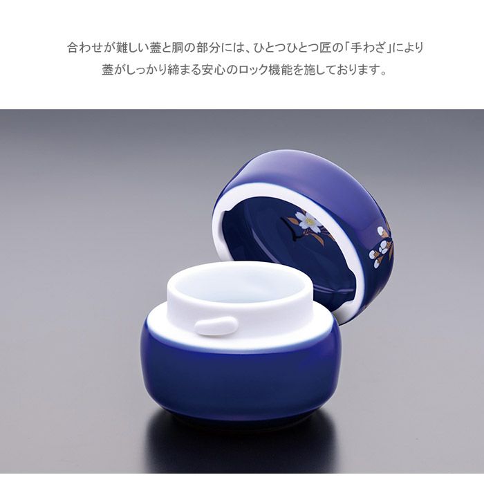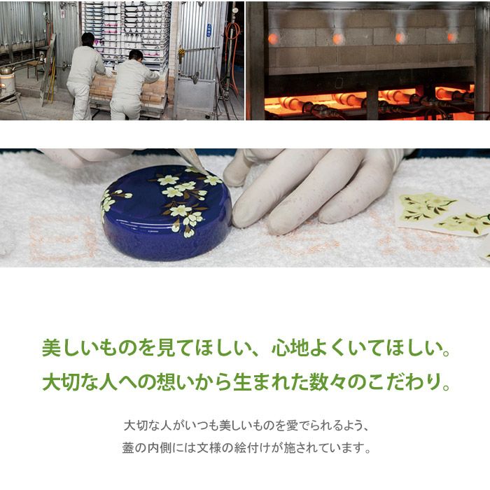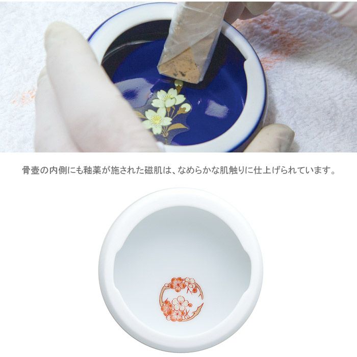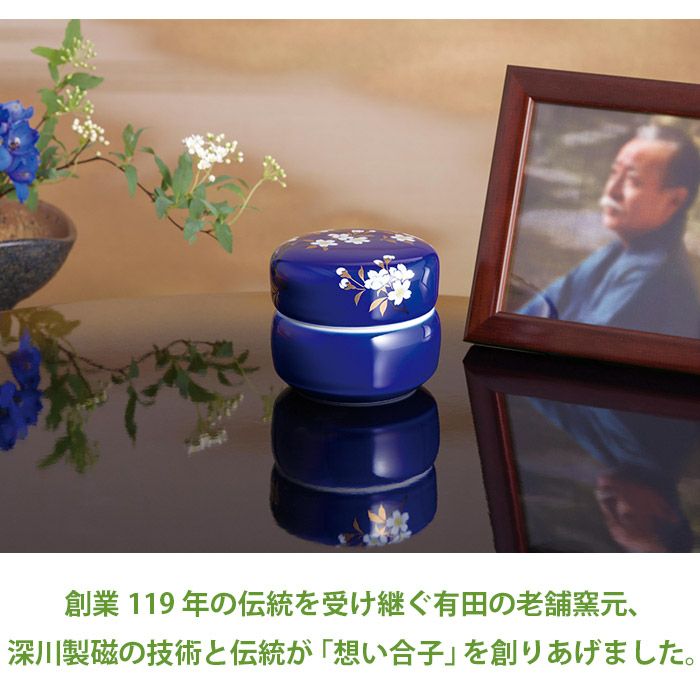 生地から焼成、絵付けまで一貫して自社で行うのは、深川様式を守る上での譲れないこだわり。その伝統を受け継ぐ匠たちの手業から「想い合子」が生み出されます。意匠は「さくら花枝」。日本人の心に響く可憐な美しさを、見上げる蓋の内側に咲かせました。ご遺骨用の巾着もお付けして、銘入りの桐箱にお収めします。