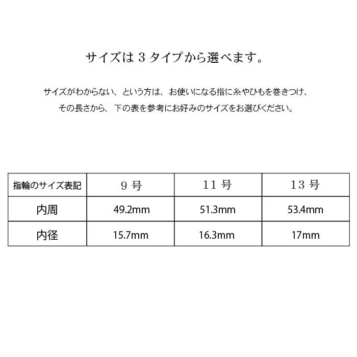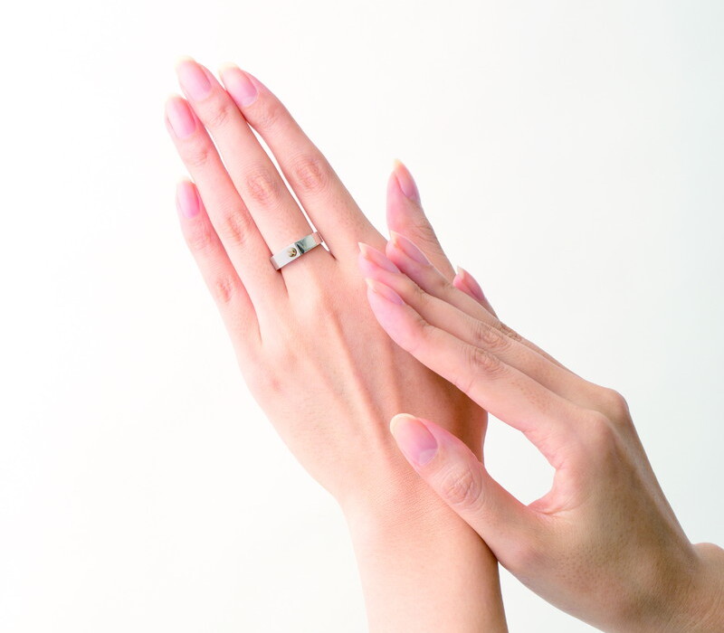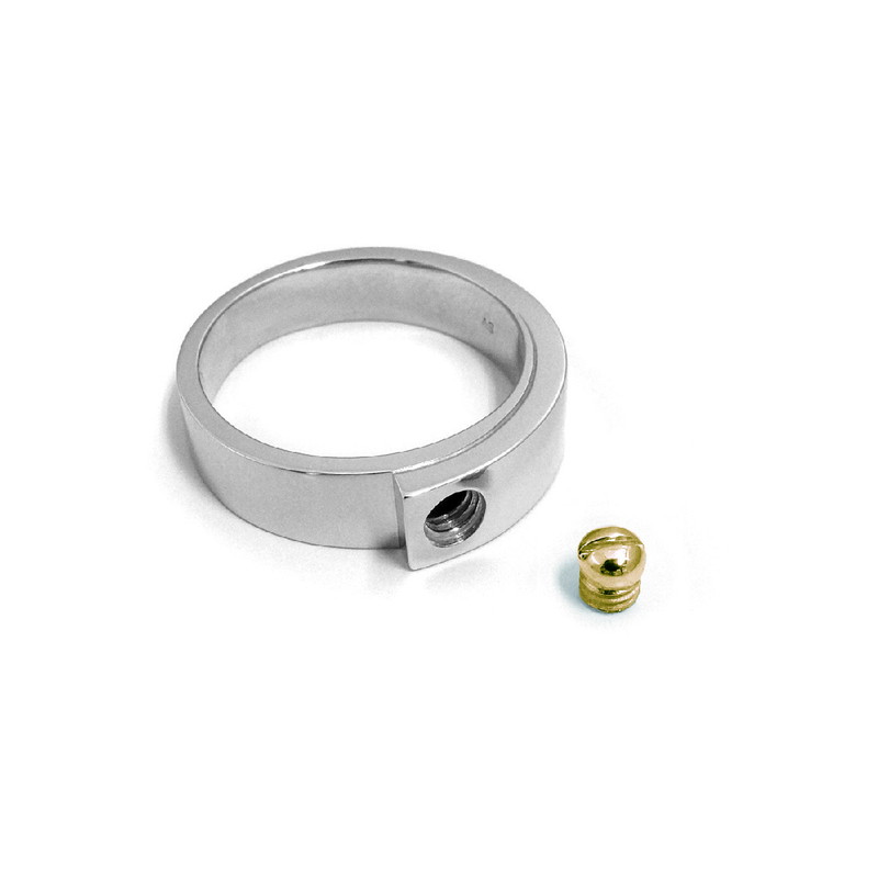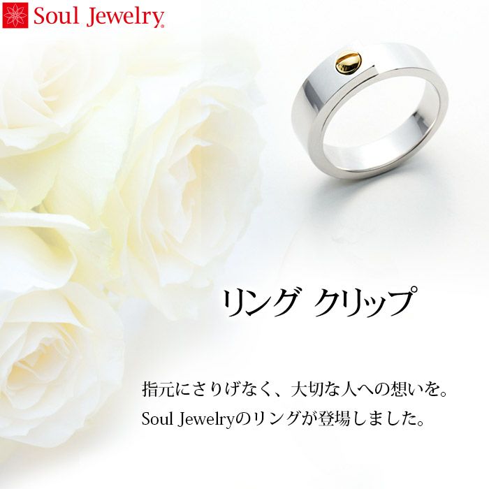 ネジをあえて表側に配置し、デザインの一部に。ゴールドの丸みを持たせたネジがアクセントで、シンプルながら個性的なデザインです。リング クリップは、重なり合う部分を留めるように配されたネジがアクセント。ご遺骨をお納めするためのネジをあえて指輪の前面に置き、金色のメッキをかけておしゃれにまとめました。ネジが内側にあるタイプではないので、ご不安を感じられる方にも安心なゆるみ止めを付属品にお付けしました。サイズは3タイプから選べます。