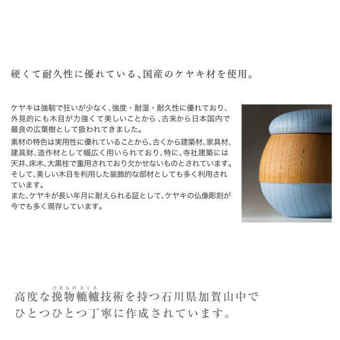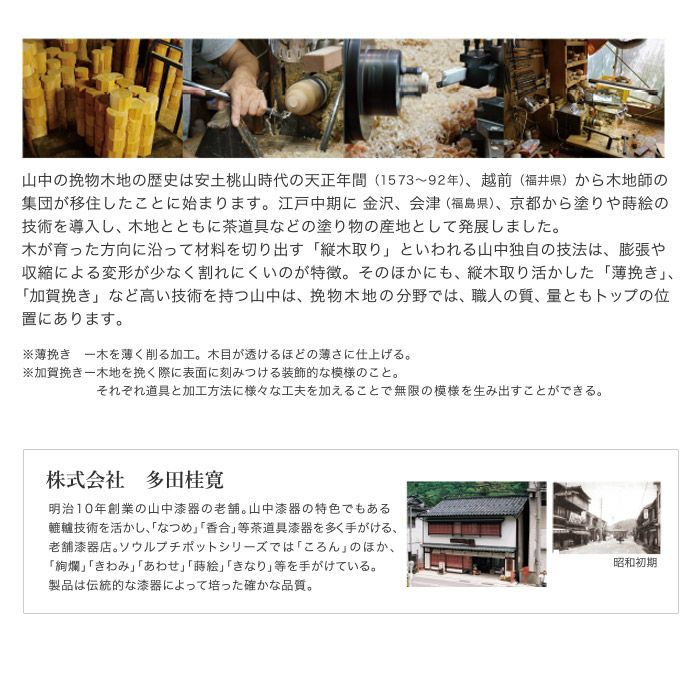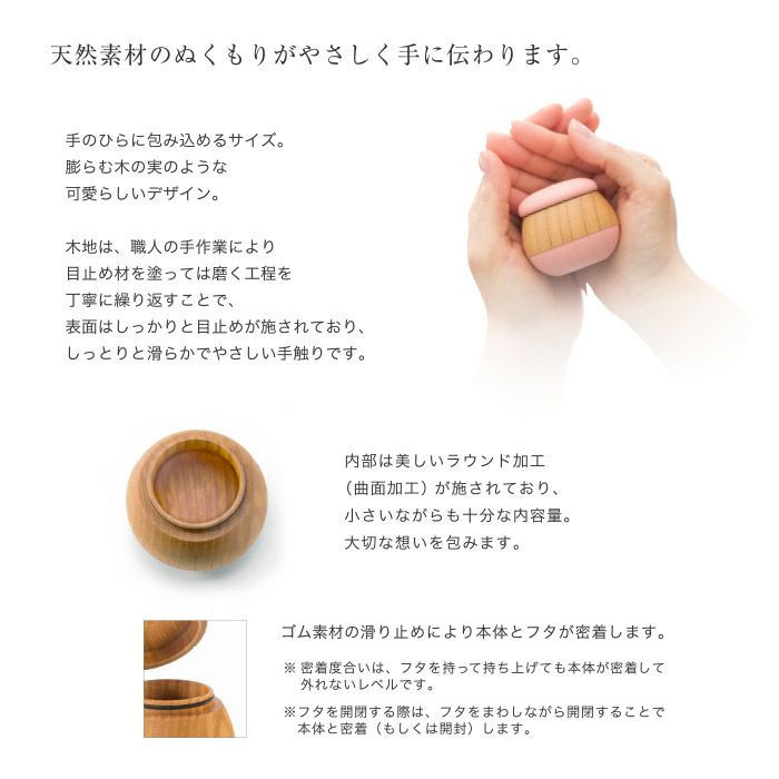 木目の美しさを活かしながら着色された優しい色合い。モダンなデザインの木素材のソウルプチポット。天然素材のぬくもりがやさしく手に伝わります。心安らぐペールトーンからお選びいただけます木目を活かしながら美しく見せる「目はじき塗り」で彩られた、色とりどりのパステルカラーです。着色には「目はじき塗り」を採用漆器は下地加工を施し、「研ぎ」「中塗」を繰り返し、最後に上塗り。完成品は漆独特の光沢があり、木目は全く見えないものが多いですが、「目はじき塗り」は木の導管部分を漆で埋めずに、との粉や地の粉で目止めを行い、木が持つ独特な風合いを表現、木目を美しく見せながら彩色します。本漆では再現できないペールトーンはウレタン塗装によるもの。ポピュラーな塗料による塗装で、本漆と比較すると、お手入れが簡単で扱いやすい特色があります。