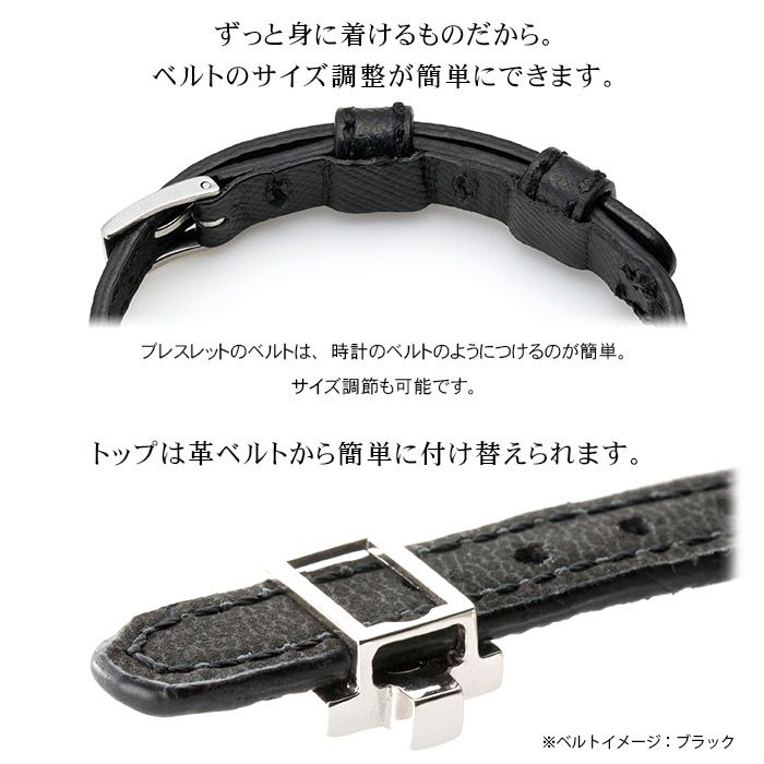 さりげなく身に着けられるレザーブレスレット。太めのレザーにステッチ入りでシックな仕上げ。ブレスレットには革素材を使用しています。革は長くお使いいただくと、どうしても傷みやすいもの。付け替えがしやすいように、トップは革ベルトから抜ける作りになっています。また、肌が直接触れるベルトの裏側には抗菌素材の裏地を使用。長く快適にお使いいただけます。