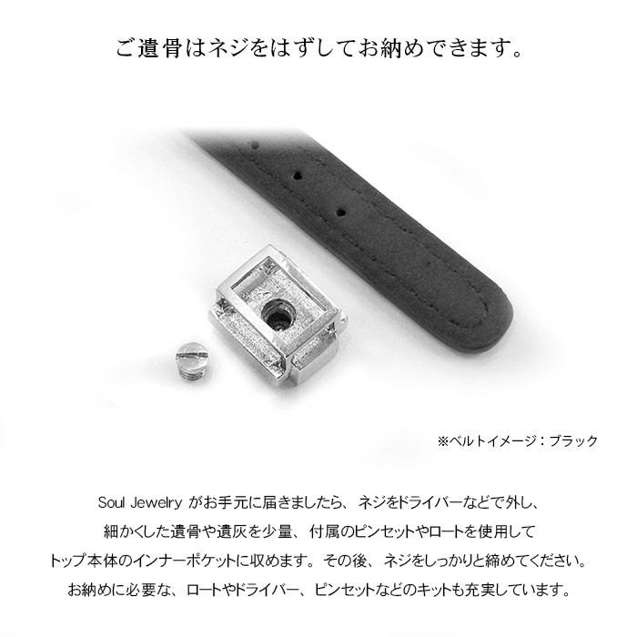 ネジを外し、細かくした遺骨や遺灰を少量、付属のロートを使用してトップ本体のインナーポケットに収めます。その後、ネジをしっかりと締めてください。※ネジは、ゆるんだり、外れたりするおそれがあります。ご心配な方は固着剤を少量ネジ部に付けて固定させてください。