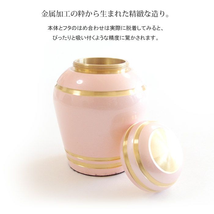 上質な色彩と質感を併せ持つ 真鍮製のソウルプチポット。高い質感と堅牢な作りの真鍮製のミニ骨壺。やわらかな曲線と落ち着いたたたずまいが大切な方を心地よく包み込みます。色は『パールピンク』。優しいピンク色をベースに、上品なパールの輝きを出しました。
