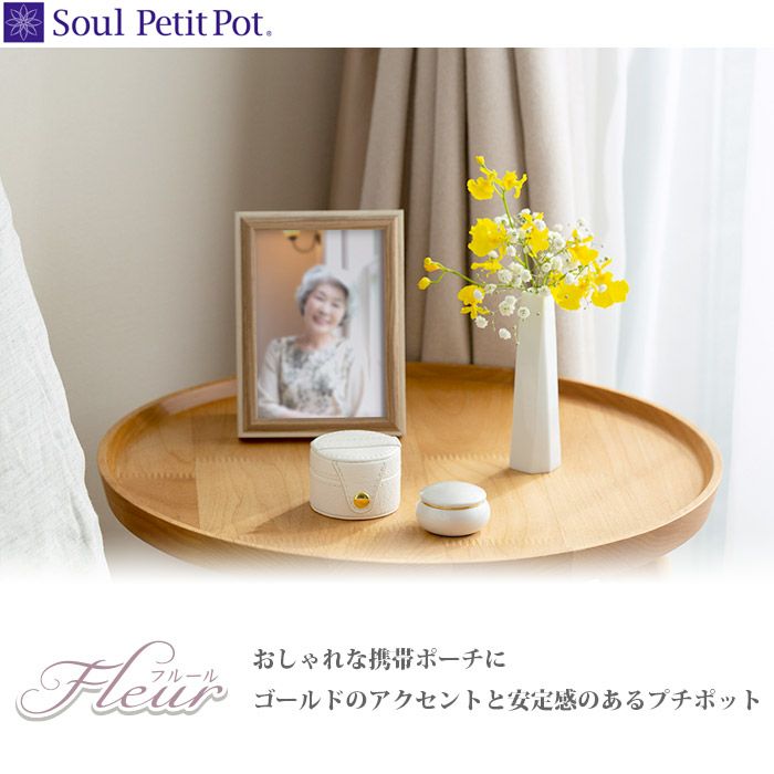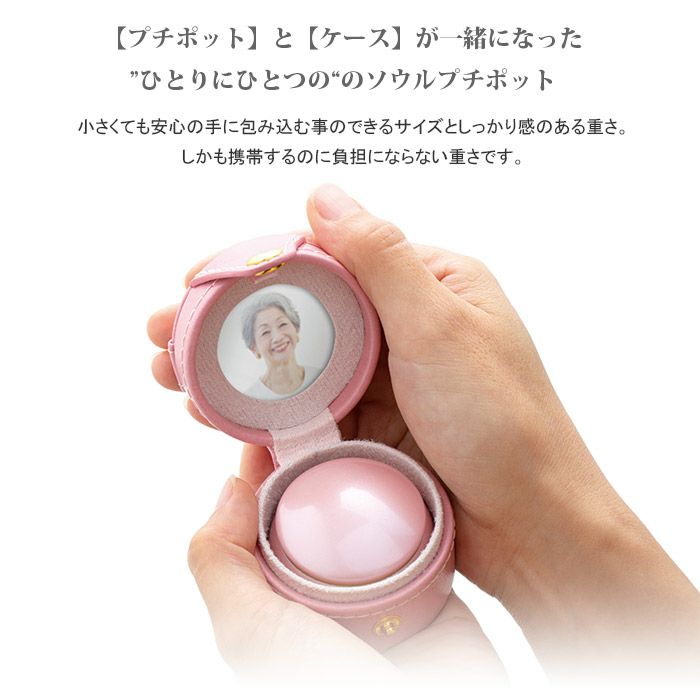 おしゃれな携帯ポーチにゴールドのアクセントと安定感のあるプチポット。コスメポーチのようなおしゃれで落ち着いたデザインと安定感のあるフォルムプチポットを収めるケースは、厚手で丈夫な合成皮革製。傷つきづらい表面仕上げ。大きめのホック止めですから、しっかりポーチをカバーします。部屋置きでも骨壺とも判別できない、コスメポーチのような安定感のある落ち着いたフォルムのポーチはポットの大きさにぴったりと合い、持ち運びなどでポットの蓋のゆるみや外れを防ぎます。大切な画像や思いをミニフレームにポーチの内側にはミニフレームが付いているので写真やメッセージを入れることができます。